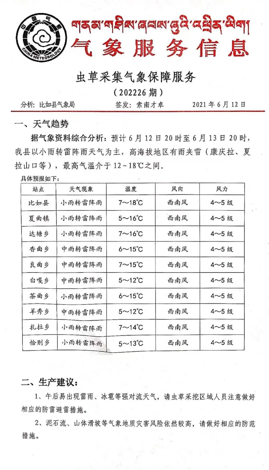 據(jù)氣象資料綜合分析:預(yù)計(jì)6月12日20時(shí)至6月13日20時(shí), 那曲比如縣以小雨轉(zhuǎn)雷陣雨天氣為主,高海拔地區(qū)有雨夾雪(康慶拉、夏 拉山口等),最高氣溫介于12~18c之間。