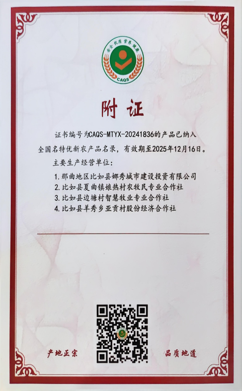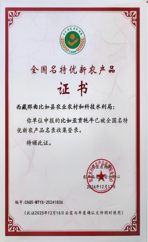 近日,農(nóng)業(yè)農(nóng)村部農(nóng)產(chǎn)品質(zhì)量安全中心正式發(fā)布“2024年第三批全國名特優(yōu)新農(nóng)產(chǎn)品名錄”。其中,由比如縣申報的“比如亞貢牦牛”成功入選該名錄!這標(biāo)志著比如縣在深入推進(jìn)“智慧牧業(yè)”建設(shè)、促進(jìn)高原特色現(xiàn)代牧業(yè)高質(zhì)量發(fā)展方面取得了又一重要成果。
